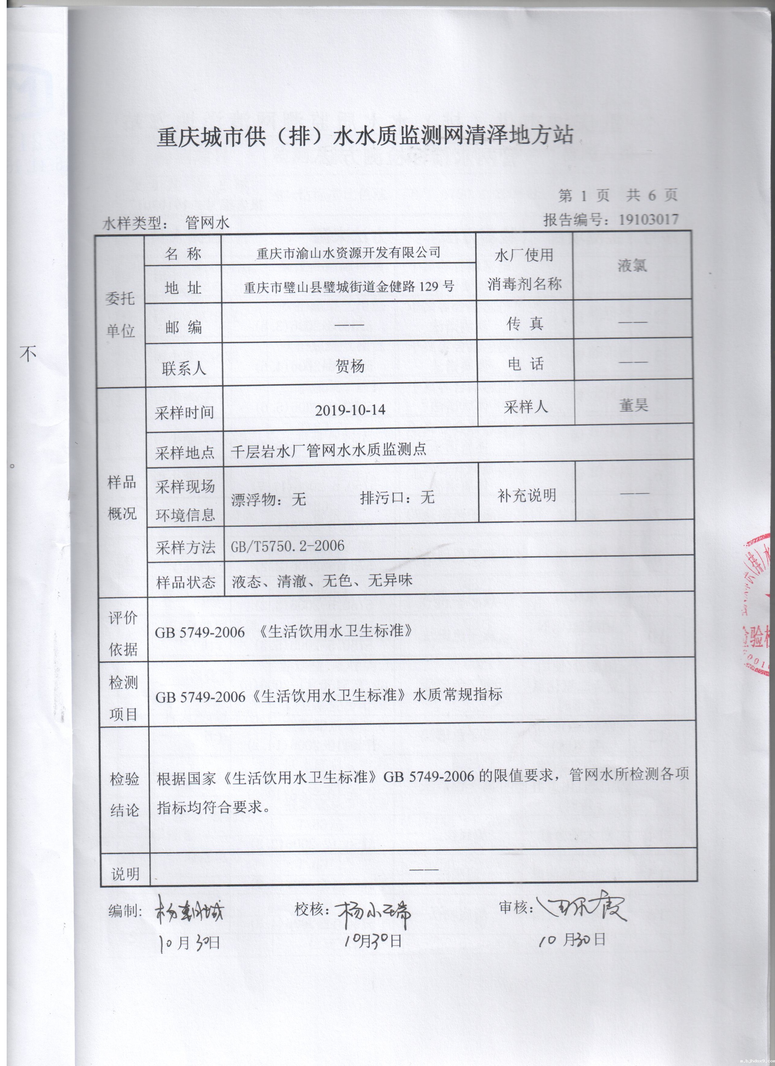 千层岩水厂2019年10月管网水(42项)